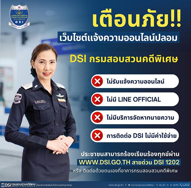 DSI แจ้งเตือนภัย เว็บไซต์แจ้งความออนไลน์ปลอม!!! 26 กุมภาพันธ์ 2567 โดย police / ข่าวประชาสัมพันธ์,ข่าวฝากประชาสัมพันธ์ DSI แจ้งเตือนภัย เว็บไซต์แจ้งความออนไลน์ปลอม!!!DSI กรมสอบสวนคดีพิเศษ– ไม่รับแจ้งความออนไลน์– ไม่มี Line Official– ไม่มีบริการจัดหาทนายความ– การติดต่อ DSI ไม่มีค่าใช้จ่ายประชาชนสามารถร้องเรียนร้องทุกข์ผ่านhttps://www.dsi.go.th/ สายด่วน DSI 1202หรือ ติดต่อด้วยตนเองที่อาคารกรมสอบสวนคดีพิเศษ