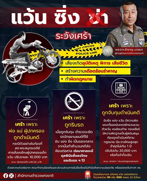 พล.ต.ท.สำราญ ฯ เผย สำนักงานตำรวจแห่งชาติปราบปรามเด็ดขาด เด็กแว้น รถซิ่ง ป่วนเมือง สร้างความเดือดร้อน สกัดเข้ม 3 ทาง สายออกทริปยกล้อต้องระวัง! พร้อมงัด 4 มาตรการ “ขับ – ซ้อน – เชียร์ – ชักชวน – ผู้ปกครอง” โดนแน่ รับโทษหนัก คุก ปรับ ริบรถ