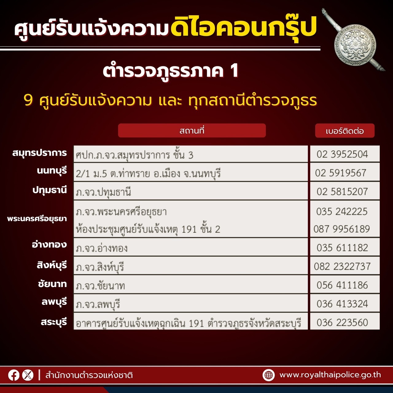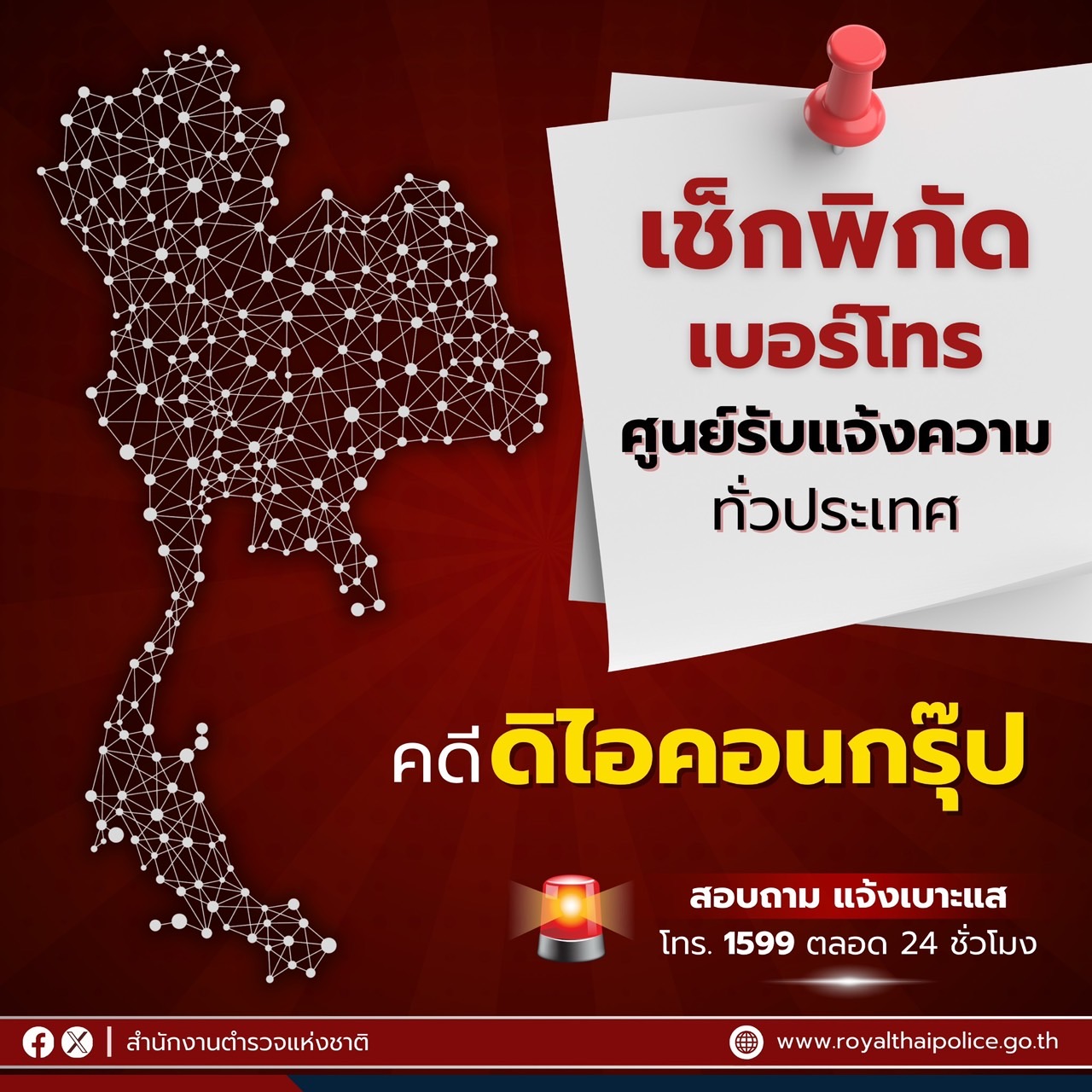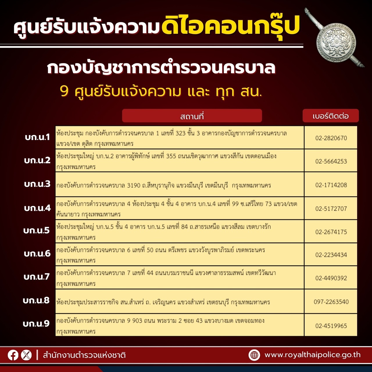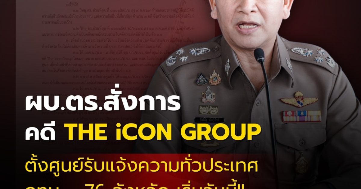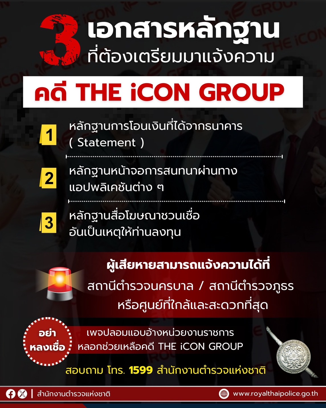 ศูนย์รับแจ้งความ คดี THE iCON GROUP 20 ตุลาคม 2567 โดย police / ข่าวประชาสัมพันธ์,ข่าวฝากประชาสัมพันธ์ สำนักงานตำรวจแห่งชาติเปิด “ศูนย์รับแจ้งความ คดี THE iCON GROUP” ทั่วประเทศ 9 ศูนย์ใน กทม. พื้นที่ดูแลของกองบัญชาการตำรวจนครบาล และ 76 ศูนย์ ทุกจังหวัดในพื้นที่การดูแลของตำรวจภูธรภาค 1 – 9 เพื่ออำนวยความสะดวกให้แก่ประชาชนผู้เสียหาย และลดความยุ่งยากในการแจ้งความ FacebookFacebookXTwitterLINELine