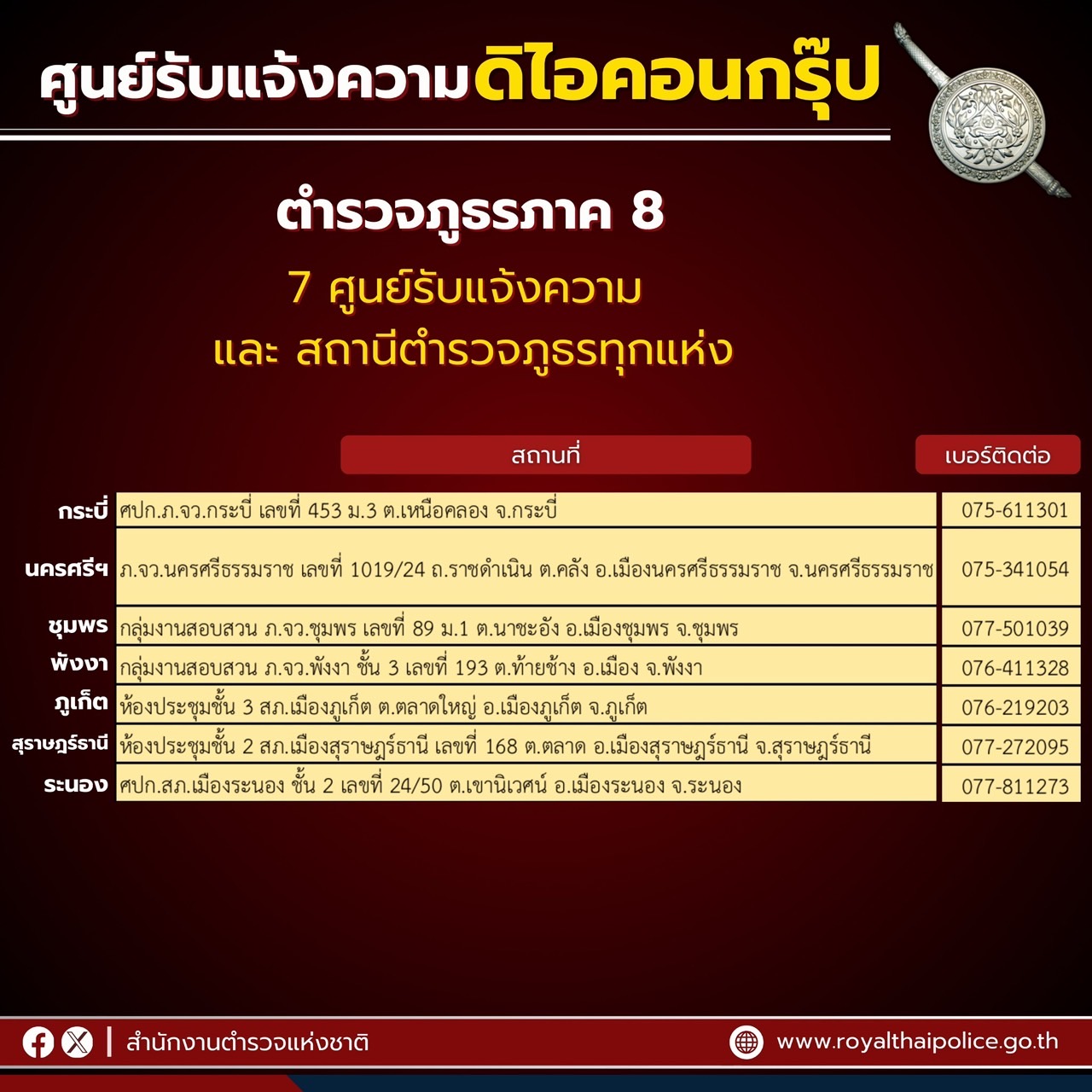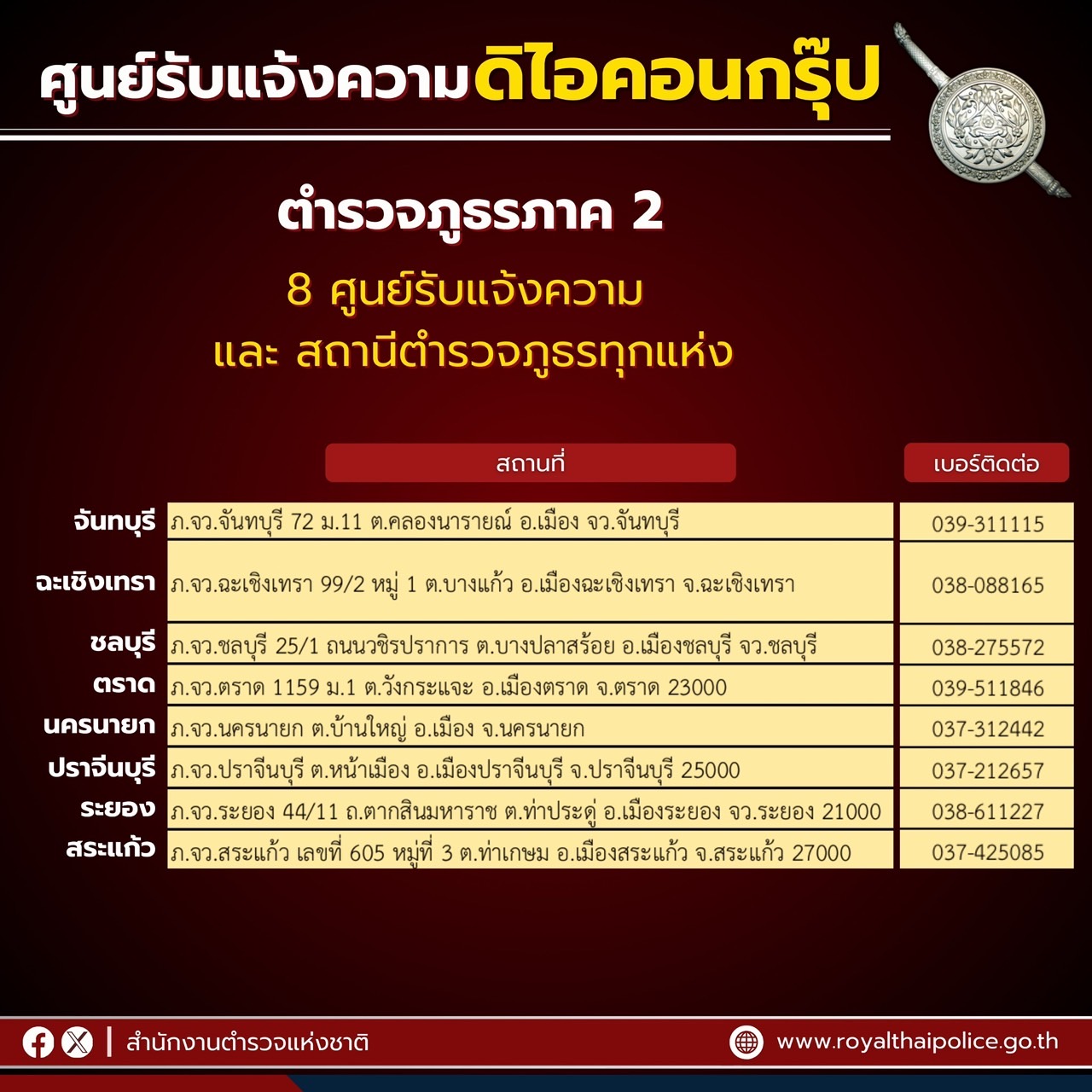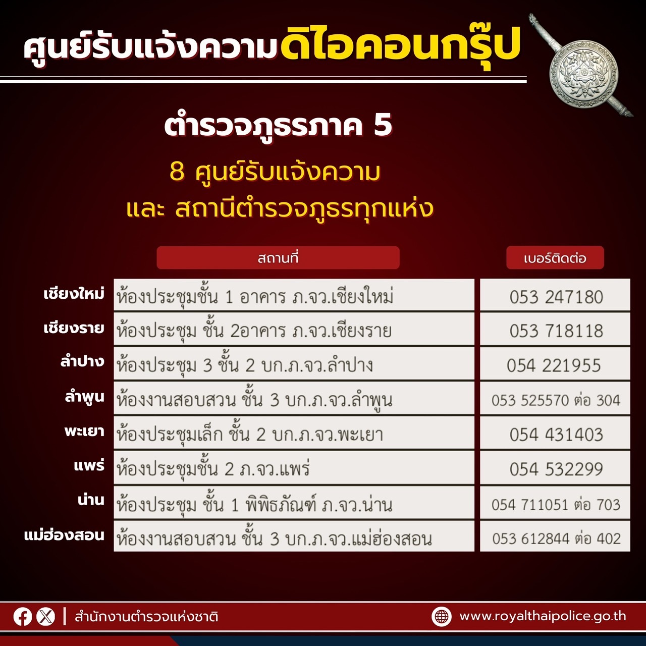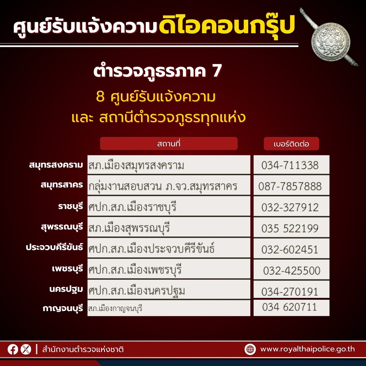ศูนย์รับแจ้งความ คดี THE iCON GROUP 20 ตุลาคม 2567 โดย police / ข่าวประชาสัมพันธ์,ข่าวฝากประชาสัมพันธ์ สำนักงานตำรวจแห่งชาติเปิด “ศูนย์รับแจ้งความ คดี THE iCON GROUP” ทั่วประเทศ 9 ศูนย์ใน กทม. พื้นที่ดูแลของกองบัญชาการตำรวจนครบาล และ 76 ศูนย์ ทุกจังหวัดในพื้นที่การดูแลของตำรวจภูธรภาค 1 – 9 เพื่ออำนวยความสะดวกให้แก่ประชาชนผู้เสียหาย และลดความยุ่งยากในการแจ้งความ FacebookFacebookXTwitterLINELine